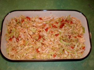 Kupus narezati na trakice, pomiješati ga u posudi sa nasjeckanim pelatima (i sa svim sokom od pelata) i sjeckanim lukom, povegetiti ili posoliti, popapriti pa premjestiti u malo nauljeni lim za pečenje. Pokriti alu folijom i peći u pećnici na 180℃ oko 40 min. Povremeno promiješajte.