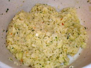 U međuvremenu rižu skuhati na vodi začinjenoj sa malo vegete. Kuhanu rižu ocijediti pa ju pomiješati sa kosanim peršinom, 1/2 polovicom nasjeckanog luka i naribanim sirom.